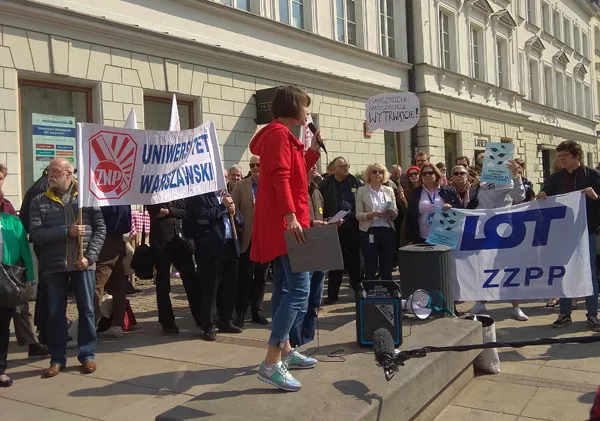 Na podporu svých kolegů se tak dnes shromáždili před varšavskou univerzitou její vyučující i studentky a studenti, aby vyjádřili solidaritu se stávkujícími učiteli. Zazněly projevy podpory stávkujícím učitelům, ale i nepedagogickým zaměstnankyním a zaměstnancům. Podpořit pracovníky a pracovnice ve školství přišli i členové odborů LOTu (polské aerolinky, pozn. redakce), kteří sami v nedávné době stávkovali za lepší podmínky. Shromáždění tak upozornilo, že nejde jen o platy učitelek a učitelů, ale o celkovou budoucnost školství, které je pro rozvoj země klíčové.