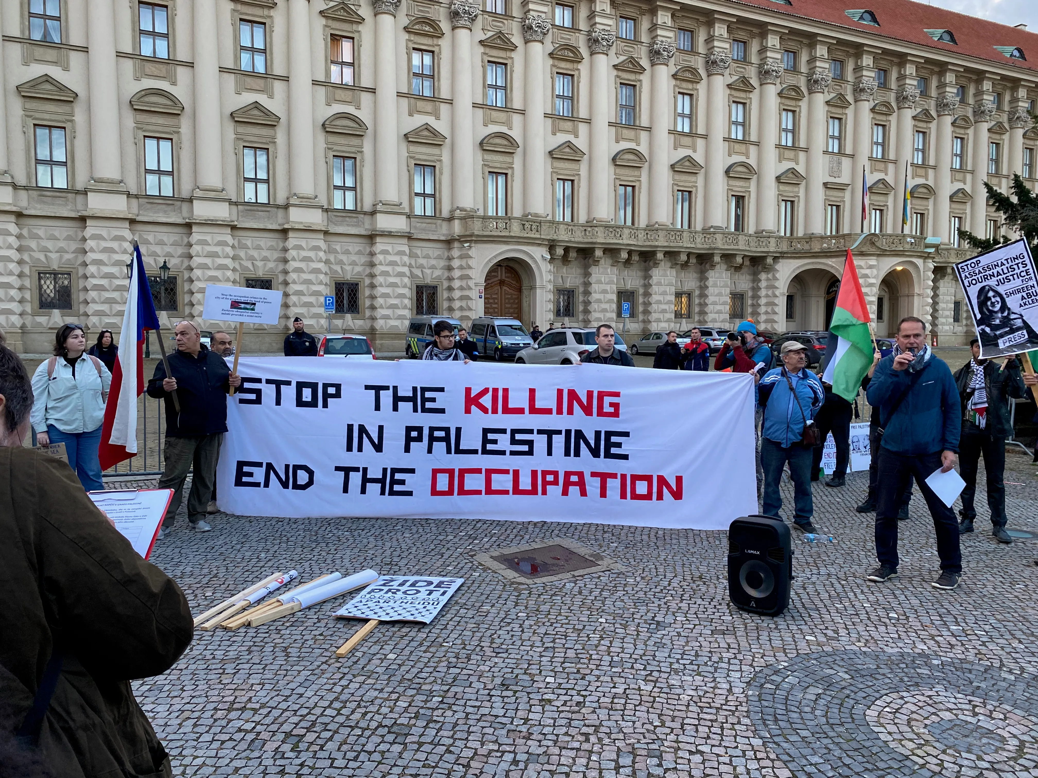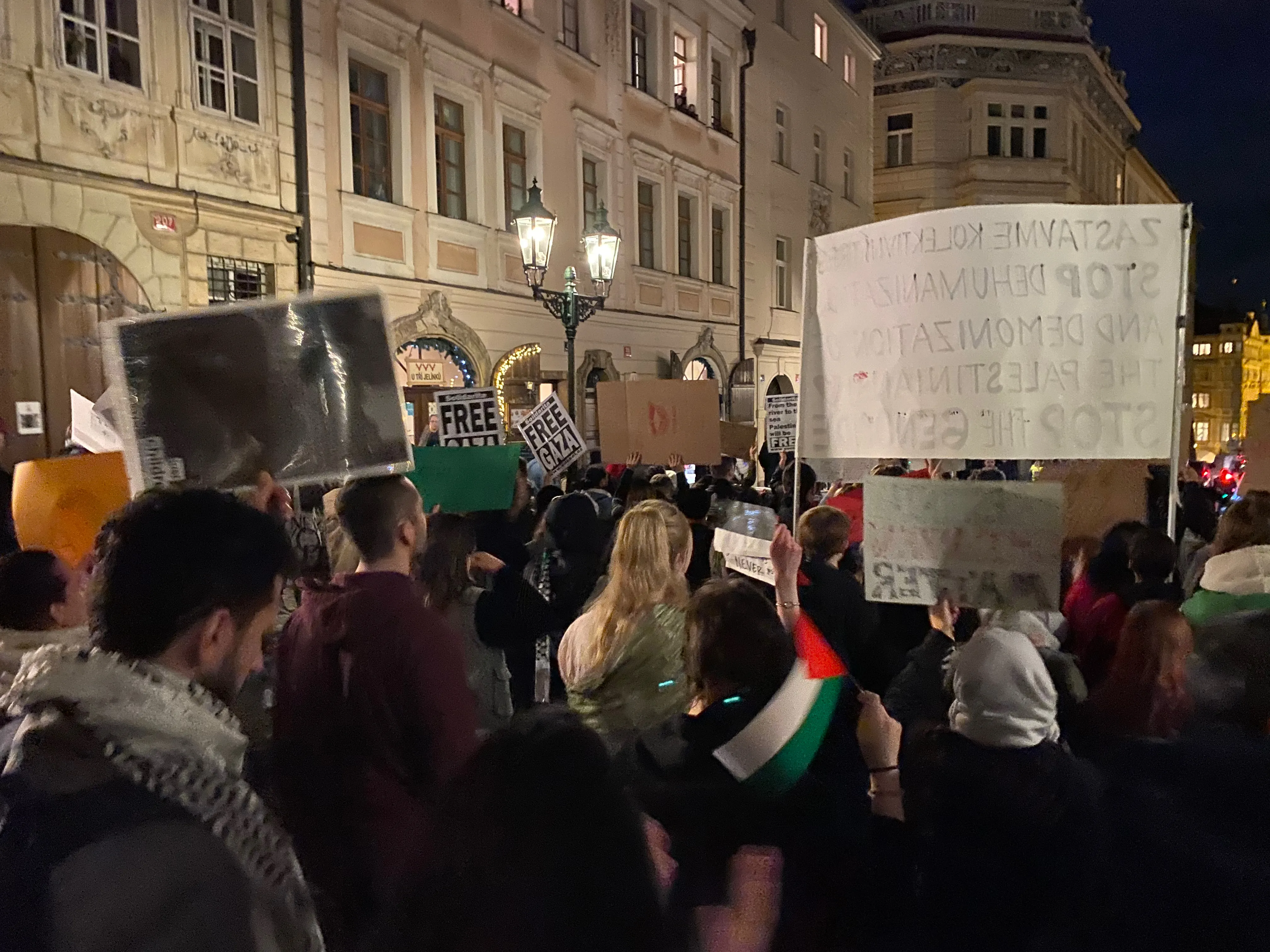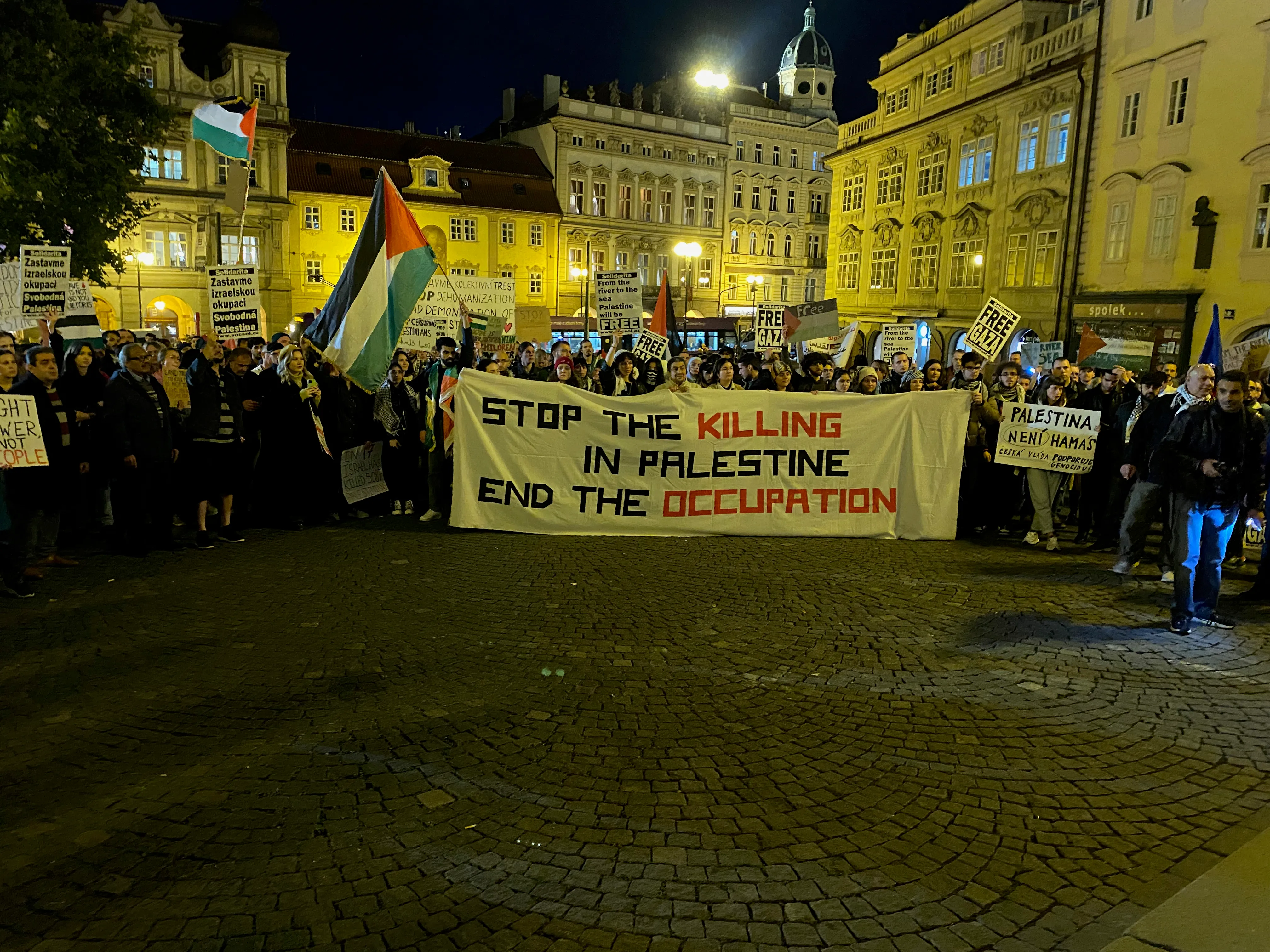 Od dlážděných uliček Loretánského náměstí až k ikonickému Pražskému hradu účastníci pozvedli své hlasy za spravedlnost, za lidská práva. Zatímco slunce zapadalo a světla města ozařovala jejich cestu zněla jejich hesla jako „Svobodná Palestina“, „Konec okupace“, „From the river to the see, all the people will be free“ (Od řeky až k moři, budou všichni svobodní) atd. Na každé zastávce zaznívaly vášnivé projevy, které posilovaly poselství tohoto setkání.