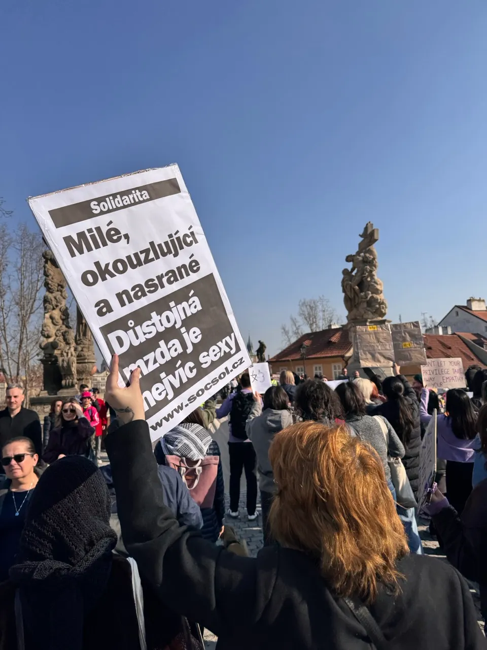 Pojďme si ujasnit jednu věc. Třídní boj se neobejde bez feminismu a feminismus se neobejde bez třídního boje. Mezi námi pracujícími, studenty a důchodci nejsou jen bílí čeští muži. Jsme tady i my ženy, migranti a migrantky, queer lidé, všichni, které se vládnoucí kapitalistická třída snaží oddělit od zbytku společnosti. My toto nesmíme nikdy přijmout, nesmíme se nechat rozdělit a nesmíme nikoho nechat pozadu a otočit se k němu zády. I proto bych vás ráda pozvala na demonstraci proti krajní pravici, kterou pořádá iniciativa Společně proti rasismu a fašismu v sobotu 22. 3. na náměstí Jana Palacha. Protože boj proti kapitalismu není jen o mzdách, je to také boj proti pošlapávání práv každé a každého z nás.